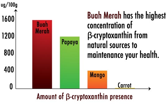 Buah Merah (Red Fruit) is also a rich source of natural Vitamin E, Omega 3,6,9 that are important anti-oxidant to destroy oxygen free radicals that attack our healthy cells. The higher level of anti-oxidants in our body helps to slow down aging process and reduce the risk of developing chronic diseases. Therefore it is recommended to consume Buah Merah (Red Fruit) oil extract daily to maintain the level of β-Cryptoxathin and anti-oxidants in the range associated with lower risk of chronic disease.